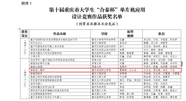 近日,重庆市教育委员会发布了《关于第十届重庆市大学生合泰杯单片机应用设计竞赛获奖情况的通报》,从通报中获悉,由beat365官网汽车与电子工程学院教师夏朝辉、文水兵指导的文尤龙、周旭梅、田杭、叶志4名学生,在全市23所参赛学校的414个参赛队中与众多本科院校学生同台竞技,最终以“智能老人看护系统”作品荣获重庆市二等奖。