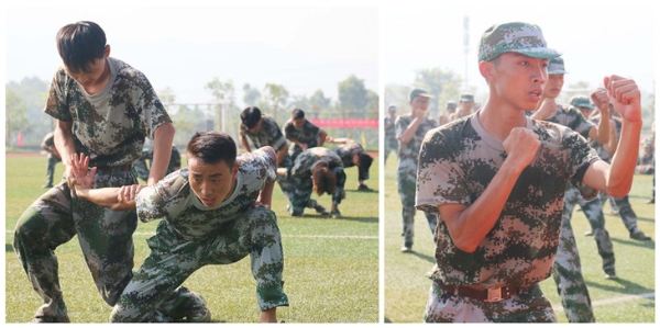 表演项目精彩纷呈。由女生连组成的队列示范,整齐划一,动作标准流畅;男生擒敌拳方队,动作干脆有力、虎虎生风,擒敌技术是部队侦察兵必须掌握的基本技能,通过短短十几天的训练,同学们掌握了擒敌动作要领,前扑、侧翻,一招一式尽显英雄本色;由24名男生组成的格斗方队,干脆利落的动作十分帅气,格斗基本技术尽显男儿本色;最后出场的是由600余名女生组成的手语操方队,她们在操场上分为两排,摆出了“电信2011—2017”的图样,并在《国家》的音乐下进行手语操表演,十分震撼。