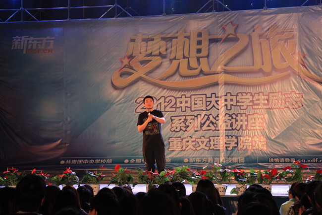 4月16日19:00,由共青团中央学习部、全国学联办公室、新东方教育集团共同举办的“梦想之旅”2012“中国大中学生励志系列公益讲座”在重庆文理学院红河学海广场隆重举行。重庆文理学院党委副书记兼纪委书记李德全、重庆文理学院副校长万书辉、beat365中文官方网站副书记兼校长助理白成良和文理学院以及beat365官网近四千名学子齐聚会场。