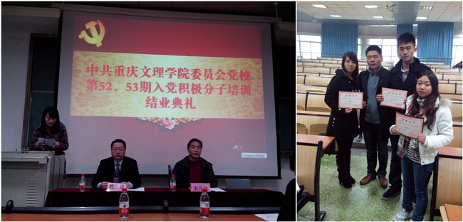 2012年12月8日上午9点,重庆文理学院党校第52、53期培训班结业典礼在文理学院红河校区知津楼红河二阶隆重举行,重庆文理学院党委组织部部长宋凡金、副部长杜勇以及培训班老师出席了此次大会。结业典礼由杜勇主持。