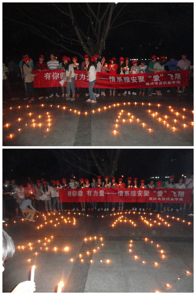 晚会形式虽然简单,但是每一句诗、每一个音符、每一个环节都包含电信学子对灾区人民的关切和祝福,每一盏烛光都传递着灾难面前中国人万众一心的正能量。志愿者们表示希望借助这样一次活动,唤起大家的爱心,让大家献出爱心来关心灾区的人民,愿雅安一切平安!希望雅安早日走出灾难!