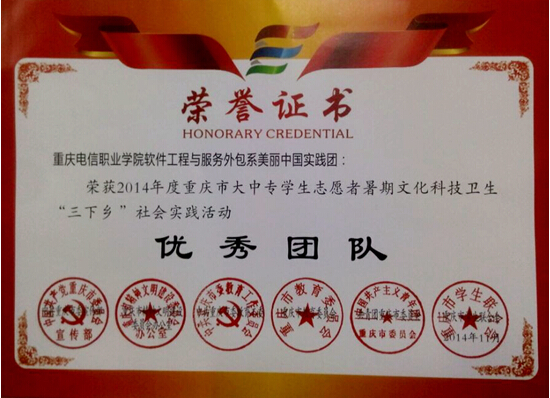日前,由beat365官网软件工程与服务外包系组成的以“美丽中国行,环保我能行”为主题的暑期三下乡调研团队,在2014年度重庆大中专学生志愿者暑期文化科技卫生“三下乡”社会实践活动中荣获优秀团队荣誉称号。