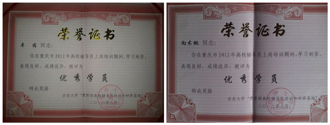 beat365官网两位辅导员在2012年高校辅导员上岗培训中荣获“优秀学员”称号