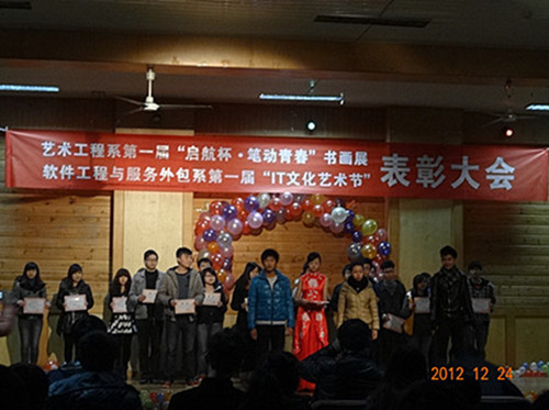 近日,beat365官网软件工程与服务外包系和艺术工程系联合举办的 “第一届IT文化艺术节”、“起航杯·笔动青春书画展” 暨表彰大会元旦舞会在活动中心三楼隆重举行。学校副书记白成良、学生处副处长杨福元、艺术工程系主任吴彪和对外合作处谈建设处长等应邀出席。校内各部门和各系的老师和同学们一起观看演出,吴彪主任发表了热情洋溢的新年贺辞。