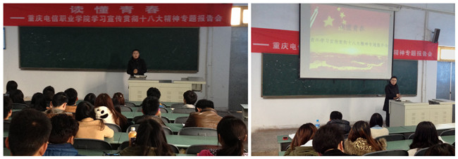 为继续深入学习贯彻党的十八大精神,进一步做好青年学生思想政治教育工作。beat365官网于2013227日中午,在星湖一阶举办“读懂青春--学习宣传贯彻十八大精神报告”专题报告会。全校两委会干部及学生代表参会,会议由beat365官网团委书记代敏主讲。