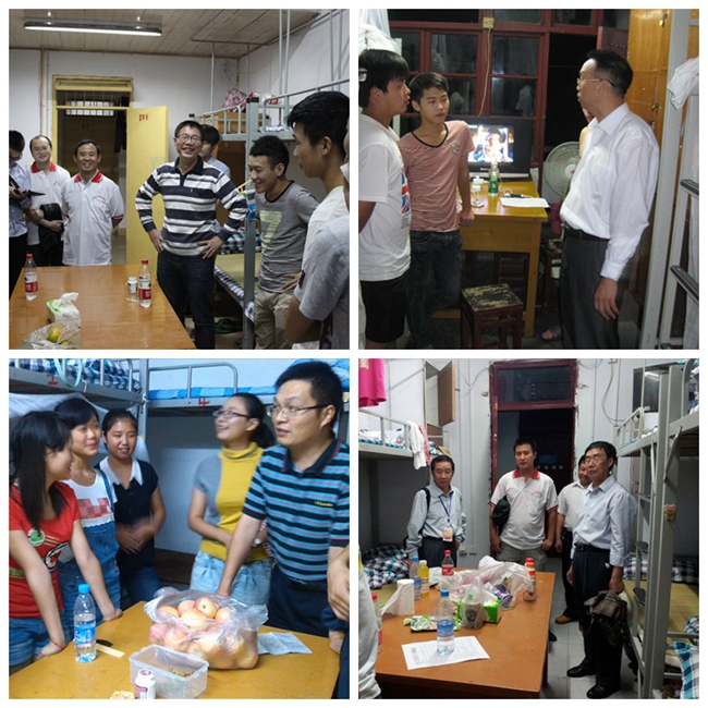 9月2日晚19:30,beat365官网校长王大成,书记周及至,副校长王成玮、白成良、钟代军,校长助理邓盛泉,率各处室负责人和各系主任及2012级辅导员亲临双竹公寓和星湖校区学生宿舍,看望2013级新生。