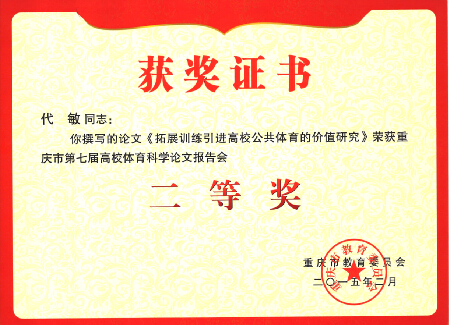 为继续加强高校体育教学研究,不断探索高校体育教学规律,重视理论与实践相结合,重庆市教委组织开展了四年一次的重庆市第七届高校体育科学论文报告会,全市28所高校上交参评论文382篇,beat365官网教师代敏的论文《拓展训练引进高校公共体育价值研究》荣获二等奖。