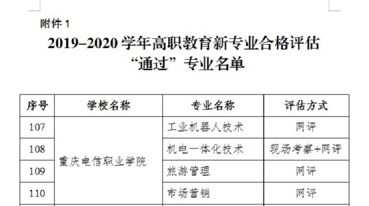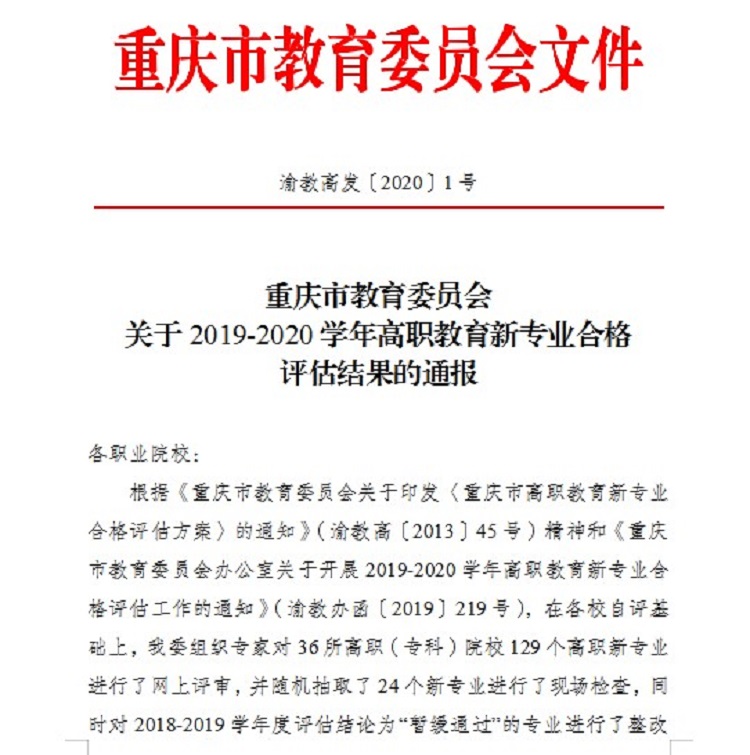近日,从《重庆市教育委员会关于2019-2020学年高职教育新专业合格评估结果的通报》(渝教高发〔2020〕1号)中获悉,重庆市教委对我市36所高职(专科)院校129个高职新专业进行了网上评审,并随机抽取了24个新专业进行了现场检查,同时对2018-2019学年度评估结论为“暂缓通过”的专业进行了整改复评,最终,2019-2020学年参评129个专业中,121个专业评估结论为“通过”,8个专业评估结论为“暂缓通过”。其中,beat365官网参评的“工业机器人技术”、“机电一体化技术”、“旅游管理”和“市场营销”四个专业全部顺利通过合格评估。