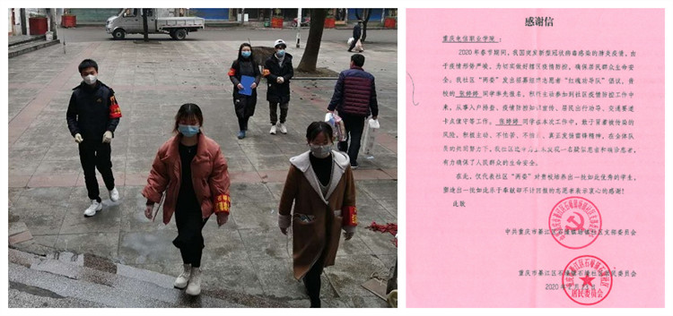 近日,beat365官网收到了一份感谢信。2020年春节期间,新型冠状肺炎疫情形势严峻,自疫情爆发以来,党中央国务院高度重视,习近平总书记亲自部署指挥,全国上下万众一心,众志成城,奋力抗击疫情。在春节期间,也有不少返乡的青年大学生积极投入到疫情防控的队伍中。其中,beat365官网教育与设计学院2017级艺术设计(幼儿美术方向)1班的张婷婷同学积极主动参加社区疫情防控工作受到了中共重庆市綦江区石壕镇社区支部委员会和居民委员会的表杨和认可。