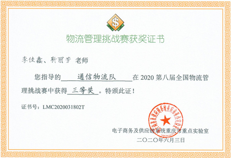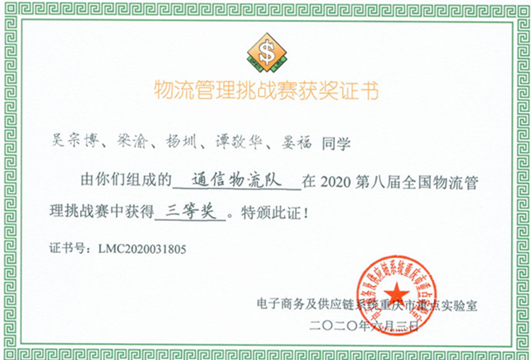近日收悉,第八届全国物流挑战赛落下帷幕,经济与管理学院物流管理教研室李佳鑫、靳丽芳两位老师带领5名学生参赛。参赛学子凭借过硬的理论知识,稳定的实训操作,最终吴宗博、樑渝、杨圳、谭敬华、宴福5位同学组成的“通信物流队”在2020第八届全国物流挑战赛中获得三等奖。