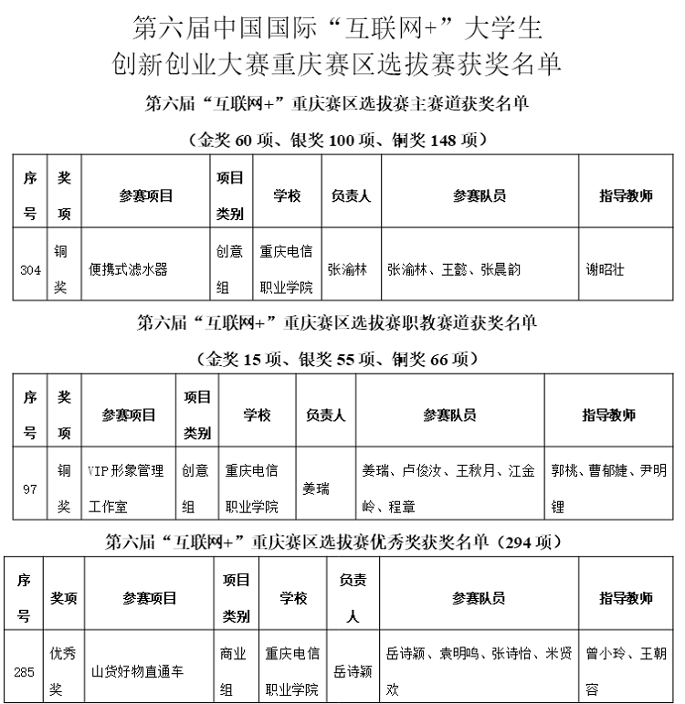近日,从《重庆市教育委员会关于第六届中国国际“互联网+”大学生创新创业大赛重庆赛区选拔赛获奖情况的通报》中获悉,beat365官网创新创业项目“便携式滤水器”获重庆赛区选拔赛主赛道铜奖,“VIP形象管理工作室”获重庆赛区选拔赛职教赛道铜奖,“山货好物直通车”获重庆赛区选拔赛优秀奖。