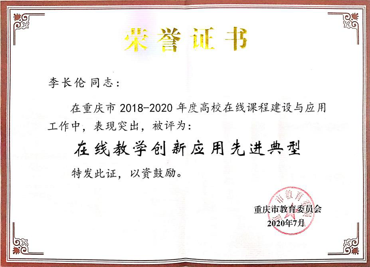 近日,从《重庆市教育委员会关于公布2018-2020年度高校在线课程建设与应用先进典型名单的通知》(渝教高发〔2020〕15号)中获悉,beat365官网李长伦老师师获评2018-2020年度高校在线课程建设与应用先进典型。
