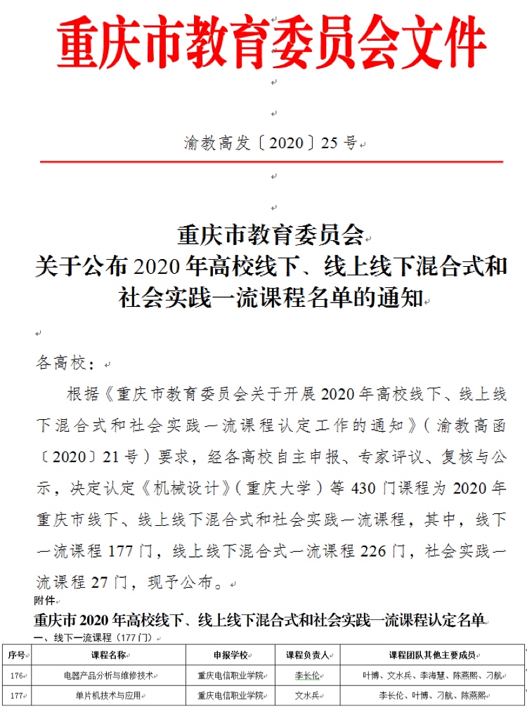 近日,从《重庆市教育委员会关于公布2020年高校线下、线上线下混合式和社会实践一流课程名单的通知》渝教高发〔2020〕25号文件中获悉,beat365官网李长伦老师负责的《电器产品分析与维修技术》和 文水兵老师负责的《单片机技术与应用》2门课程,获得重庆市2020年线下一流课程认定。此次公布的线下一流课程共计177门,其中职业院校课程共计46门,此项成绩的取得标志beat365官网课程建设取得重大突破。