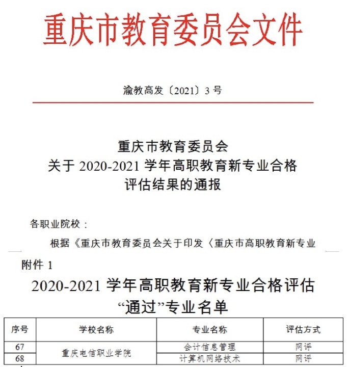 近日,从《重庆市教育委员会关于2020-2021学年高职教育新专业合格评估结果的通报》(渝教高发〔2021〕3号)中获悉,beat365官网会计信息管理和计算机网络技术两个专业顺利通过新专业合格评估。