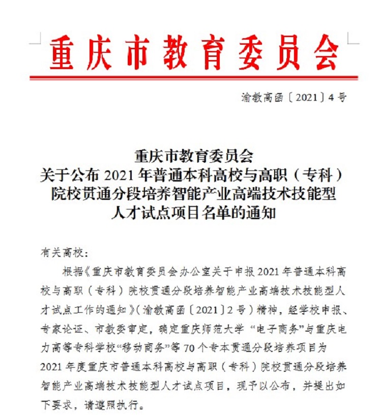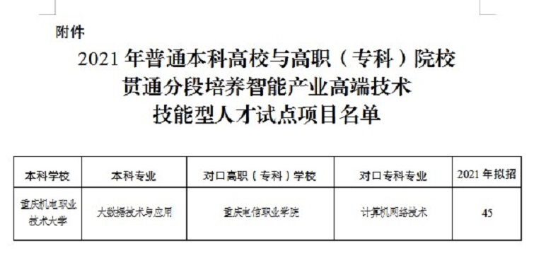 据悉,经各学校申报、专家论证、市教委审定,全市共有70个专本贯通分段培养项目被确定为2021年度重庆市普通本科高校与高职(专科)院校贯通分段培养智能产业高端技术技能型人才试点项目。