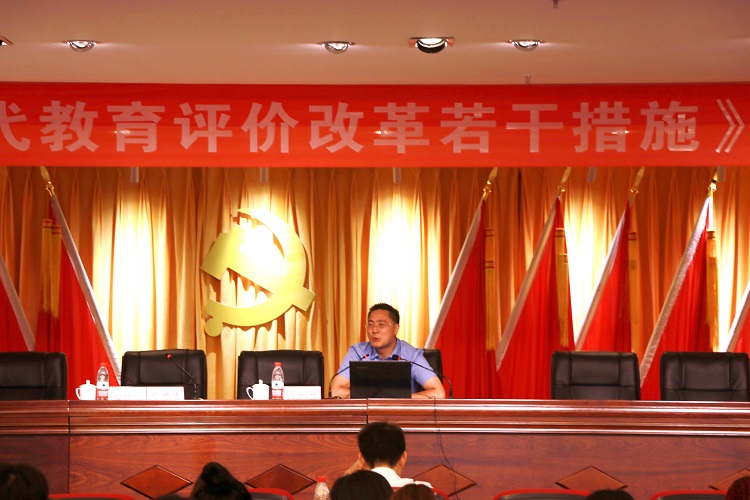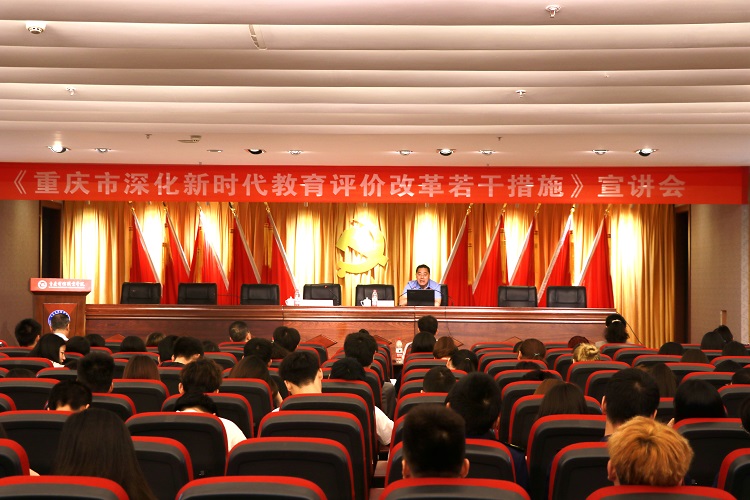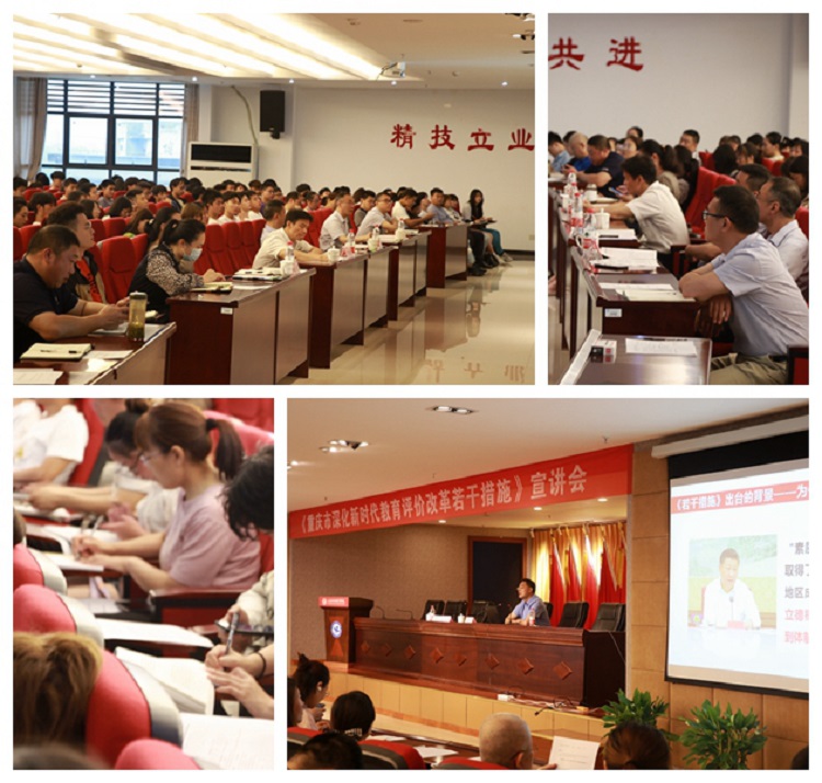 6月17日上午,beat365官网组织召开《重庆市深化新时代教育评价改革若干措施》宣讲会,重庆三峡医药高等专科学校校长陈地龙博士应邀来校进行宣讲,全校中层以上干部、各二级学院师生代表共计400余人参加宣讲会,会议由副校长皇甫涛主持。