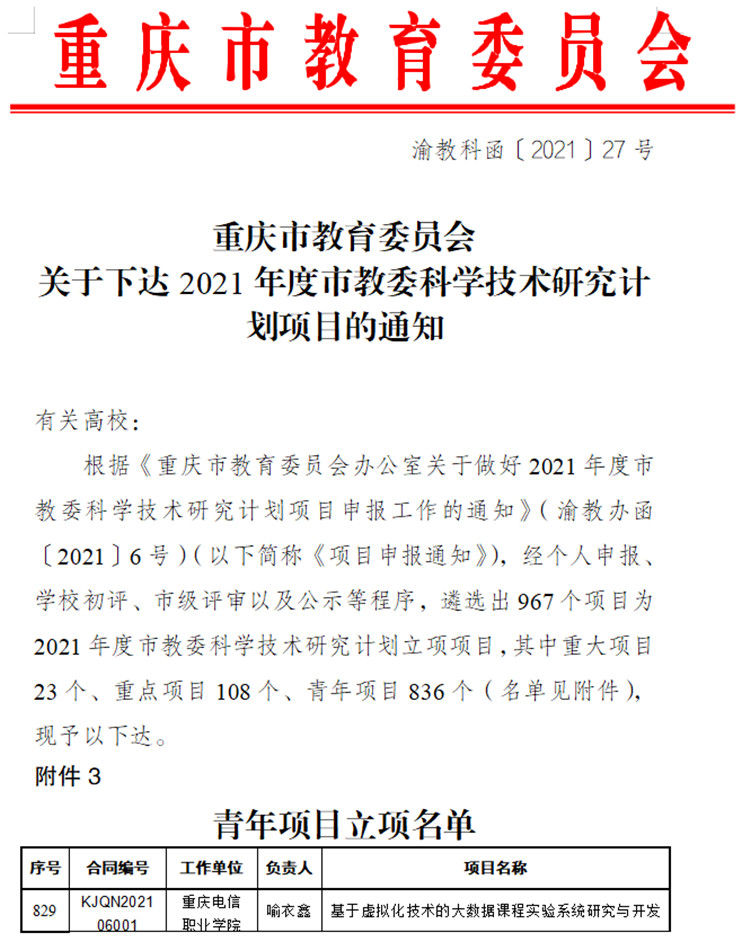 近日,从《重庆市教育委员会关于下达2021年度市教委科学技术研究计划项目的通知》(渝教科函〔2021〕27号)文件中获悉,beat365官网申报的青年项目:由喻衣鑫老师主持的“基于虚拟化技术的大数据课程实验系统研究与开发”获得立项。学校将按照《重庆市教育委员会科学技术研究计划项目管理办法》,继续加强项目指导,做好项目的管理、监督、结题等工作,确保项目按计划顺利实施。(通讯员:雷敏超)