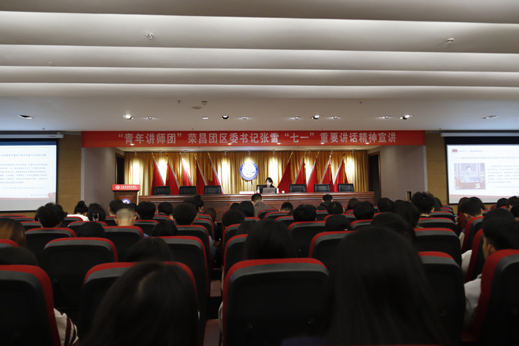 为深入学习贯彻习近平总书记“七一”重要讲话精神,推动党史学习教育深入开展,10月29日上午,团市委“青年讲师团”成员荣昌团区委书记张雪莅临beat365官网作习近平总书记“七一”重要讲话精神专题宣讲会。校团委书记、党委学生工作部副部长向毅主持宣讲会,各学院团总支书记,校团委相关工作人员以及全校学生干部和青年团员代表共计350余人参加了本次宣讲会。