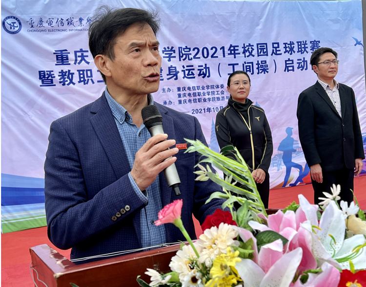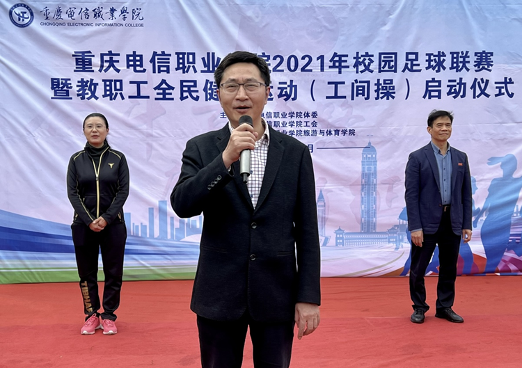 为丰富广大教职工和同学们健康快乐的课余生活,倡导全民健身,激发广大教职工和同学们强身健体的意识,让全体师生振奋精神,积极投身于教育教学工作和学习生活。10月29日下午,由校工会、校体委主办,教体学院承办的2021年校园足球联赛暨教职工全民健身运动(工间操)启动仪式在学校田径运动场火热举行。仪式由校体委办公室主任吴智勇主持,校长曹继建,党委书记张勇刚,副校长皇甫涛,党委副书记、副校长代敏出席仪式,全体教职工及学生代表参加此次活动。