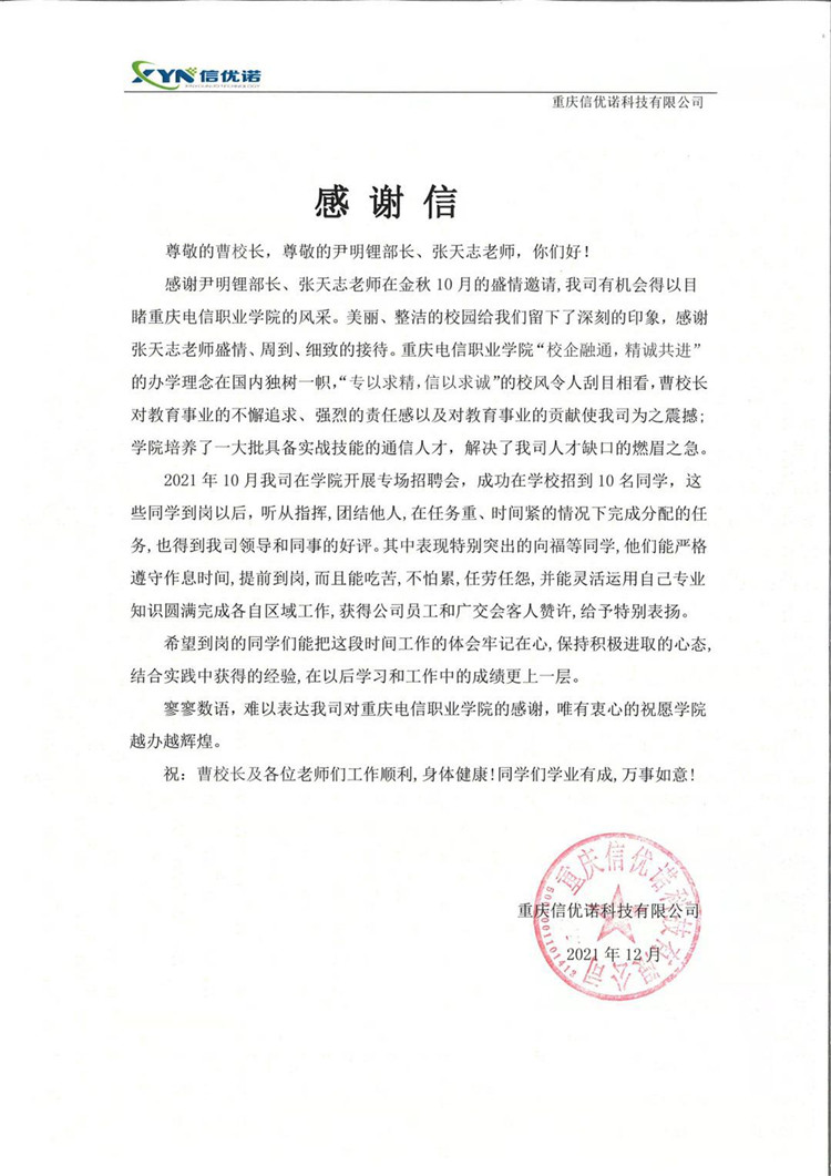 感谢信既是对beat365官网人才培养工作的认可,也是对后续工作的激励。beat365官网与重庆信优诺科技有限公司有着深厚的合作基础,beat365官网将持续与重庆信优诺科技有限公司保持良好校企合作关系,共同为区域经济社会发展贡献力量。(通讯员:李成涛)