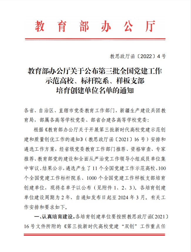 去年10月,教育部组织开展第三批新时代高校党建示范创建和质量创优申报工作。学校党委高度重视、精心部署,党委书记多次深入人工智能与电子学院党支部指导工作,人工智能与电子学院党支部书记夏敏积极组织支部班子成员研讨,修改、完善申报材料。在学校各党支部积极支持配合下,经学校党委申报、市委教育工委推荐、资格审查、专家评审、教育部党的建设和全面从严治党工作领导小组成员集中审议、结果公示等环节,人工智能与电子学院党支部成功入选“全国党建工作样板支部”培育创建名单。