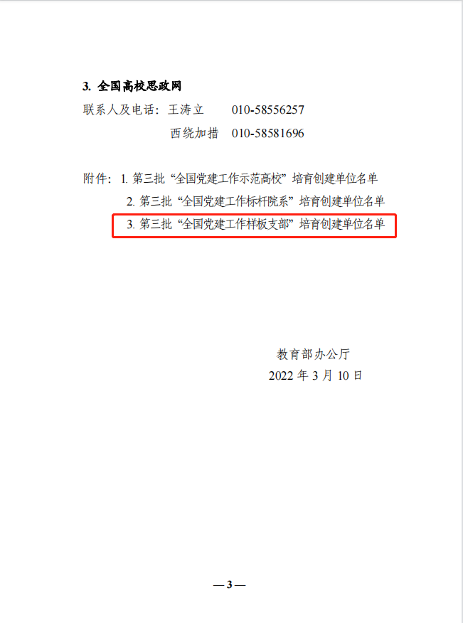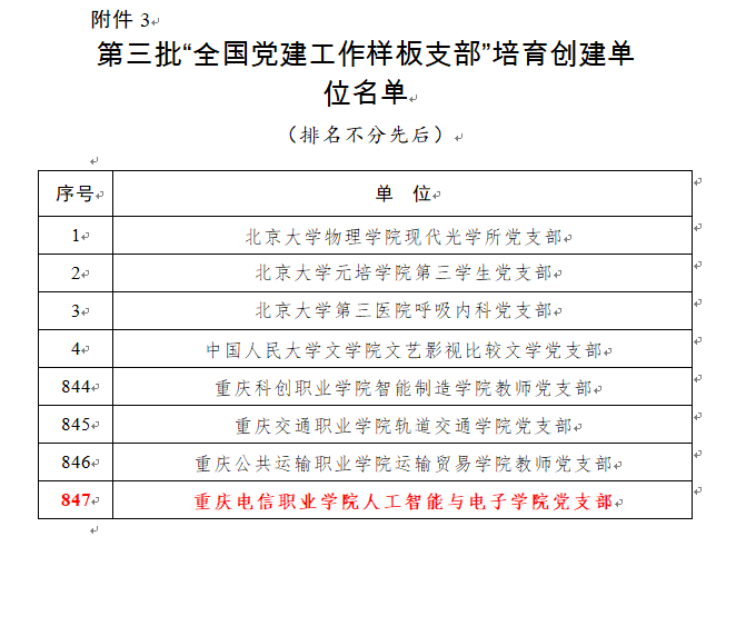 3月10日,教育部办公厅(教思政厅函【2022】4号)公布了第三批全国党建工作示范高校、标杆院系、样板支部培育创建单位名单。beat365官网人工智能与电子学院党支部入选“全国党建工作样板支部”培育创建名单,这是继2020年11月该党支部入选重庆市首批新时代高校党建“双创”样板支部培育创建单位后,学校基层党支部党建工作取得的又一项新成果。