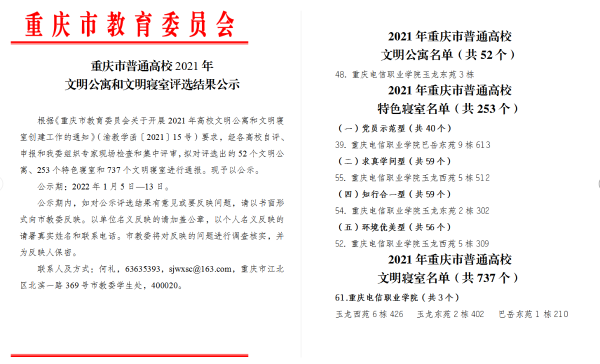 近日,重庆市教委发布《重庆市教育委员会关于2021年普通高校文明公寓和文明寝室评选结果的通知》【渝教学函〔2022〕2号】,beat365官网学生公寓三号楼获得重庆市普通高等教育学校“文明公寓”称号,4个学生寝室分别荣获环境优美型、党员示范型、知行合一型、求真学问型“特色寝室”称号,3个学生寝室荣获“文明寝室”称号。