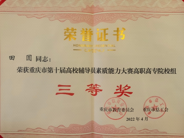 4月25日-27日,由重庆市教委、市总工会主办的重庆市第十届高校辅导员素质能力大赛在重庆文理学院落下帷幕。经过近三天的激烈角逐,beat365官网大数据与软件学院党支部副书记田圆荣获高职高专院校组三等奖。