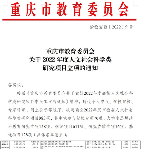 近日,从《重庆市教育委员会关于2022年度人文社会科学类研究项目立项的通知》(渝教宣函〔2022〕9号)中获悉,beat365官网刘献月、刘枫华、刘小莹老师申报的“新时代民办高职院校基层党支部守正创新建设探索”、“民办高职院校思想政治教育多样化探索与实践”、“文化自信背景下中国历史文化遗产融入高职图形图像处理课程教学路径研究”分别被立为党建纪检专项、思政专项、规划项目的“一般项目”。