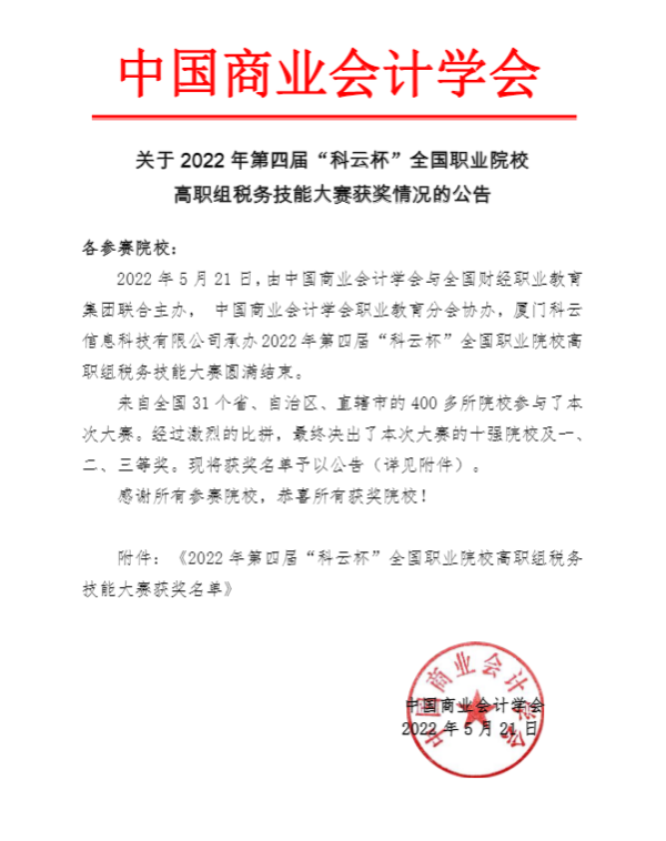 2022年5月21日,由中国商业会计学会与全国财经职业教育集团联合主办,中国商业会计学会职业教育分会协办,厦门科云信息科技有限公司承办2022年第四届“科云杯”全国职业院校(高职组)税务技能大赛正式开赛。