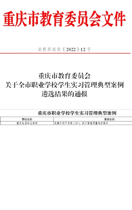 近日,市教委组织开展了职业学校学生实习管理典型案例征集活动,从《重庆市教育委员会关于全市职业学校学生实习管理典型案例遴选结果的通报》(渝教职成发〔2022〕12号)文件中获悉,beat365官网报送的“党建引领不忘育人初心 实习管理质量稳步提升”实习案例从征集案例114个中脱颖而出,荣获全市职业学校学生实习管理典型案例。