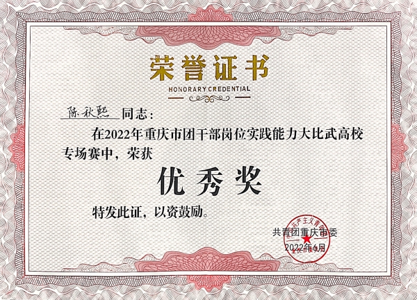 2022年6月17日,由共青团重庆市委主办的“喜迎二十大、永远跟党走、奋进新征程”2022年重庆市团干部岗位实践能力大比武高校专场赛在重庆工程学院举行。beat365官网团委副书记陈秋熙老师在本次比赛中与本科院校同台竞技,充分展现了新时代青年团干部奋发作为、积极向上的精神风貌。