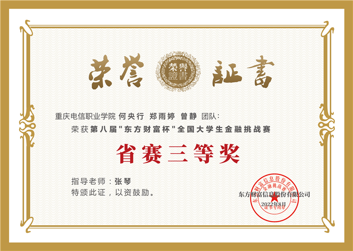 经过为期一个多月的激烈角逐,由中共青团中央青年发展部主办,东方财富信息股份有限公司、全国学校共青团研究中心承办的2022年第八届“东方财富杯”全国大学生金融挑战赛落下帷幕。在学校及学院领导的关心关怀下,由教师龙娟、张琴、牛展指导的金融服务与管理专业2020级学生王琳玲、徐远煜、张艳群代表队荣获省赛“一等奖”,2019级周勇、李鑫、张杨代表队荣获省赛“二等奖”、2020级何央行、郑雨婷、曾静代表队和蒙威、何央行、欧阳秋雨代表队荣获省赛“三等奖”,2021级徐兴豪、刘安波、杨力燕代表队荣获省赛“三等奖”,2021级唐晶、何喜连、拜合提妮萨.阿不都热衣木代表队荣获省赛“三等奖”。