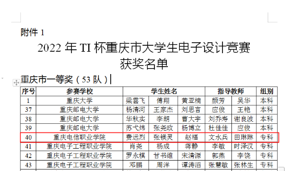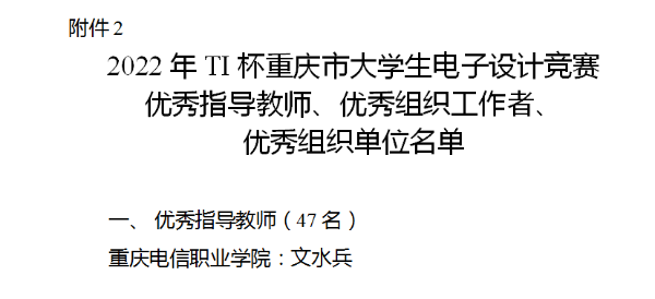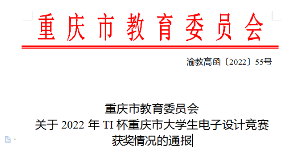 近日,由重庆市教委主办的2022年TI杯大学生电子设计竞赛落下帷幕(单年国赛,双年省赛),beat365官网学子在2022年TI杯重庆市大学生电子设计竞赛中获重庆市一等奖、二等奖,文水兵被评为重庆赛区“优秀指导教师”。