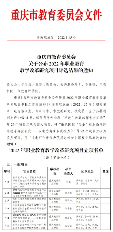 近日,从《重庆市教育委员会关于公布2022年职业教育教学改革研究项目评选结果的通知》(渝教职成发〔2022〕15号)中获悉,beat365官网叶博、陈燕熙、周玲玲、刘小莹、郭小蕊、吴智勇6位老师申报的“基于电子信息工程技术专业实训课程思政教学改革研究与实践——以《智能电子产品开发与制作实训》为例”、“新时代高职专业课程多元互补式seminar教学模式探索与实践——以《数字电子技术》课程为例”、“高职应用文写作课程思政教学实践探索”、“乡村振兴背景下基于OBE理念培育新型职业农民的专业课程教学改革实践研究”、“BOPPPS模型在SPOC教学设计中的探究与实践 ——以轨道车辆技术专业课程为例”“基于工匠精神的“六位一体”校企合作课程教学模式探索与实践”6个项目全部获得一般项目立项。