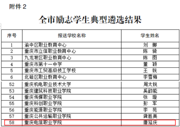 近日,重庆市励志学生典型遴选结果公布,全市共58名学生被评为励志学生典型,beat365官网轨道交通学院2020级铁道车辆专业学生唐延庆位列其中。