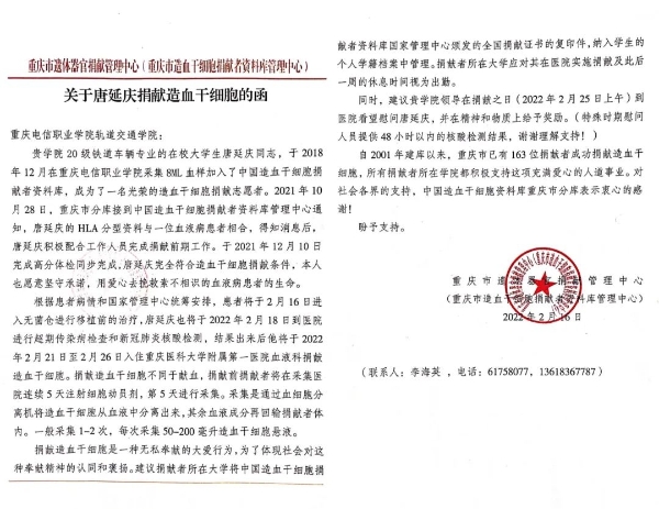 2021年11月,唐延庆接到重庆市红十字会的电话,因三年前在beat365中文官方网站的一次献血经历,现血型与一名患者匹配成功,唐延庆毫不犹豫应允,并第一时间前往重庆市红十字会进行造血干细胞志愿捐献前期准备。
