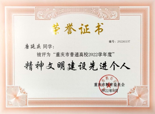 荣获重庆市普通高校2022学年度“精神文明建设先进个人”荣誉称号