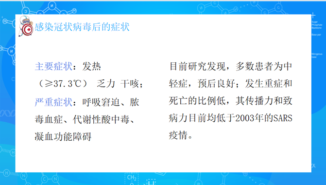 李红丽老师通过“疫情防控知识教育”专题,向同学们详细讲解了新冠病毒的来源、传播途径、感染后的症状、医院就诊的注意事项以及如何预防新冠病毒的感染等疫情防控知识;通过视频、以图文并茂的形式指导学生正确了解疫情的动态,远离谣言,相信科学;通过中外疫情防控措施事例的对比,让同学们明白了要把这次疫情当做学习的机会,要静下心来想一想自己的人生规划,树立正确的世界观、价值观、人生观,把我们祖国建设得更加强大。