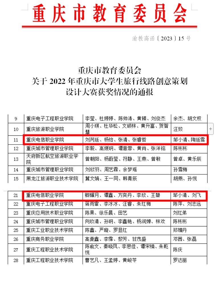 近日,由重庆市教育委员会举办的“2022年重庆市大学生旅行线路创意策划设计大赛”落下帷幕,大赛旨在进一步激发广大学生的爱国热情和创新理念,引导参赛学生主动关注了解区域文旅融合发展方向,树立创新发展理念,同时丰富文旅产业内涵,设计出形式多样的复合型、创新型旅游线路,切实提高学生的实践操作能力。学校教育与设计学院陶廷雪、邹小清、刘飞三位教师通力合作,精心组织,推选了刘芮廷、杨怡等八位同学分两个团队参加比赛,最终两个团队均荣获了高职高专组三等奖。