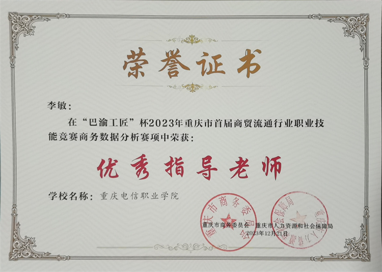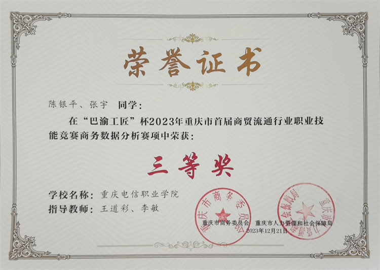 近日收悉,由学院教师王道彩、李敏指导学生参加“巴渝工匠”杯2023年重庆市首届商贸流通行业职业技能竞赛商务数据分析大赛的两支队伍分别斩获一个三等奖和一个优胜奖。两位指导教师均获“优秀指导老师”称号。