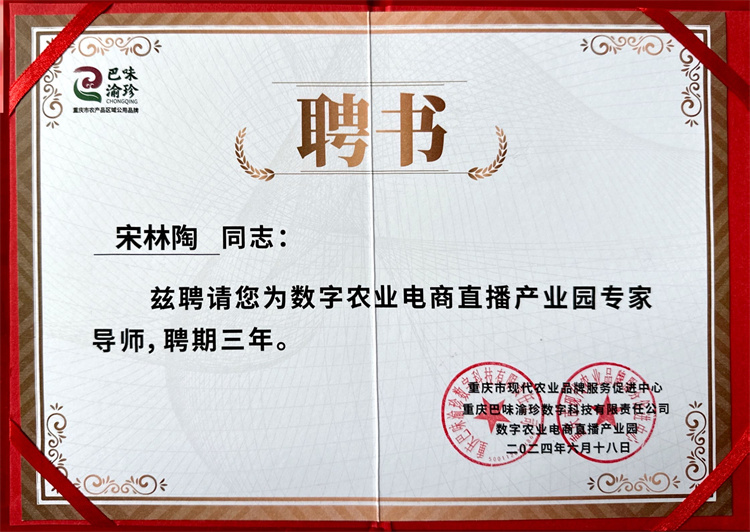 决赛通过模拟网络直播带货现场,充分展现了beat365官网学生直播带货技巧和专业水平。经过现场激烈比拼,陈永梅荣获个播二等奖,重庆巴味渝珍数字科技有限责任公司为她授予了“助农主播”证书,她的身份信息也将录入三农网红人才数据库,进行公开展示亮相。指导教师宋林陶、姜安涛也被重庆市现代农业品牌服务促进中心等3家单位,聘请为数字农业电商直播产业园专家导师。