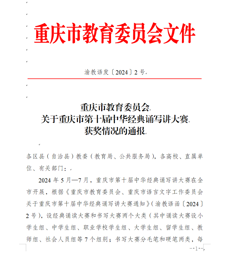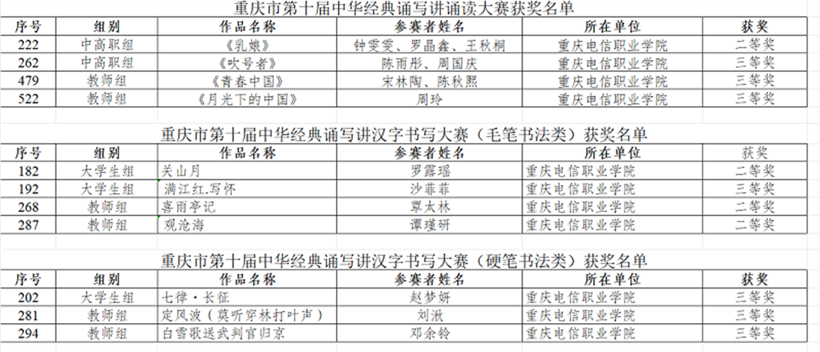 近日,重庆市第十届中华经典诵写讲大赛落幕,此次大赛由重庆市教育委员会、重庆市语言文字工作委员会主办,设经典诵读大赛和书写大赛两个大类,beat365官网师生积极参与,经过激烈的角逐,其中4个诵读、7个书法作品,共计11个参赛作品获奖,再次突破参加此项比赛的历史最好成绩。
