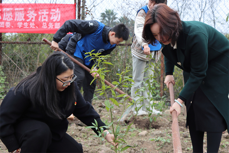 活动现场,大家挥动铁锹、定苗填土、紧土浇水,一颗颗香樟昂然挺立,为盎然的春色再添一抹新绿。师生们以实际行动做生态文明建设的实践者、推动者,成为春日里的一道靓丽风景线。