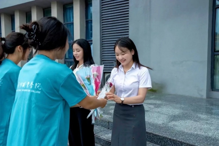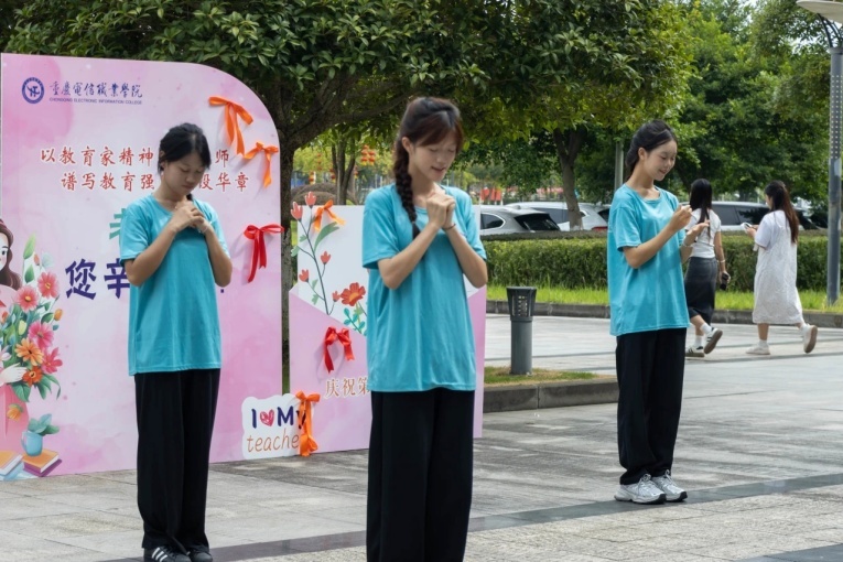 9月10日课间时分,博学楼大厅外,学生们自发组成活动队伍,为教师献上节目歌伴舞《听我说谢谢你》,歌声与舞姿吸引了过往师生的目光。同学们手捧鲜花走向在场老师,送上节日问候与诚挚感谢。